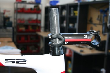 To be honest, I don’t particularly like the look of the Volcano under the stem, but it creates a stiffer set-up than having a separate dustcap and spacers. And with my massive sprinting power, I need that 0.0003% extra stiffness (insert self-ridicule). So the Volcano puts the stem at the right height in one piece, making it elegant in an engineering sense if not in an aesthetic sense.